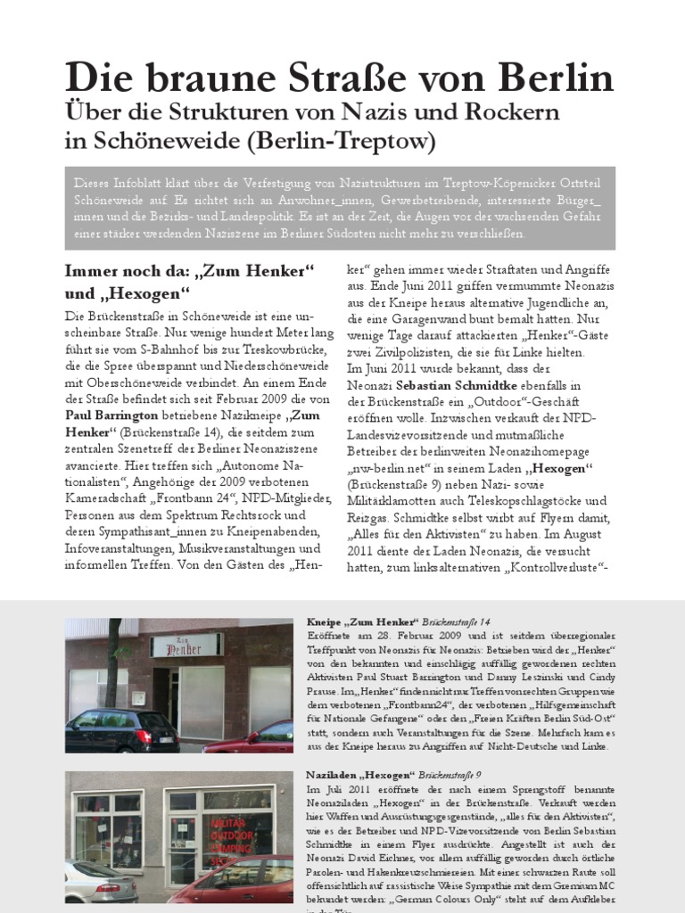 Die rechte Szene ist offensichtlich bestrebt, neben den bekannten Neonazi-Treffpunkten „Zum Henker“ und „Hexogen“, ihre Infrastruktur im Ortsteil Schöneweide weiterauszubauen.