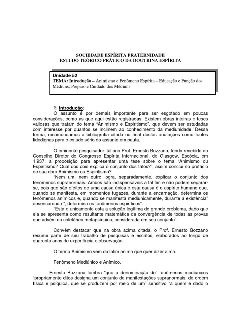 Unidade 52 TEMA: Introdução – Animismo e Fenômeno Espírita – Educação e Função dos Médiuns; Preparo e Cuidado dos Médiuns.