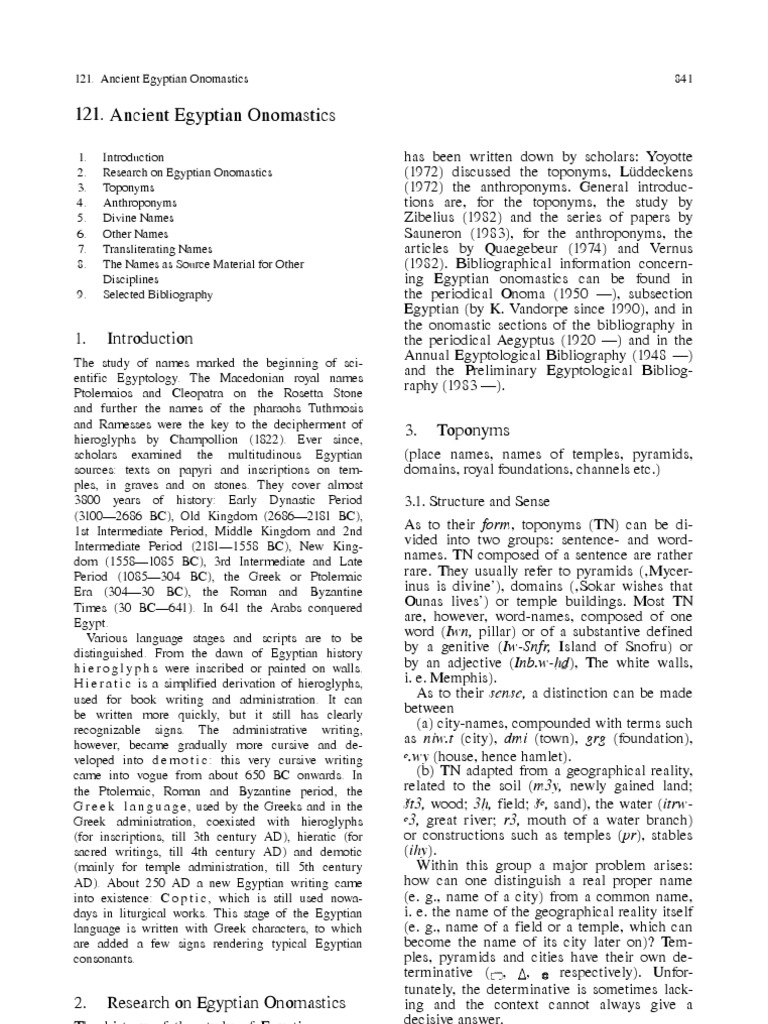 1.Introduction2.Research on Egyptian Onomastics3.Toponyms4.Anthroponyms5.Divine Names6.Other Names7.Transliterating Names8.The Names as Source Material for OtherDisciplines9.Selected Bibliography