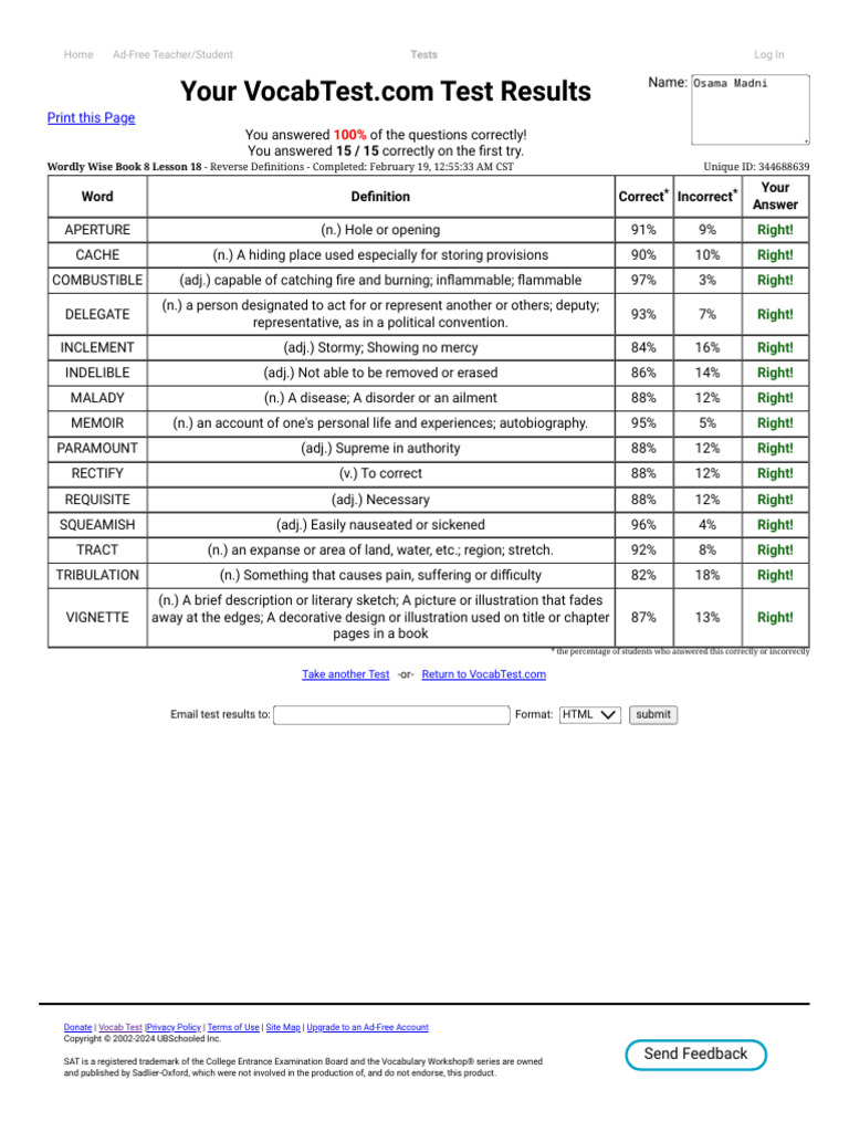 Wordly Wise Book 8 Lesson 18 - Reverse Definitions - Completed: February 19, [Link] AM CST Unique ID: 344688639