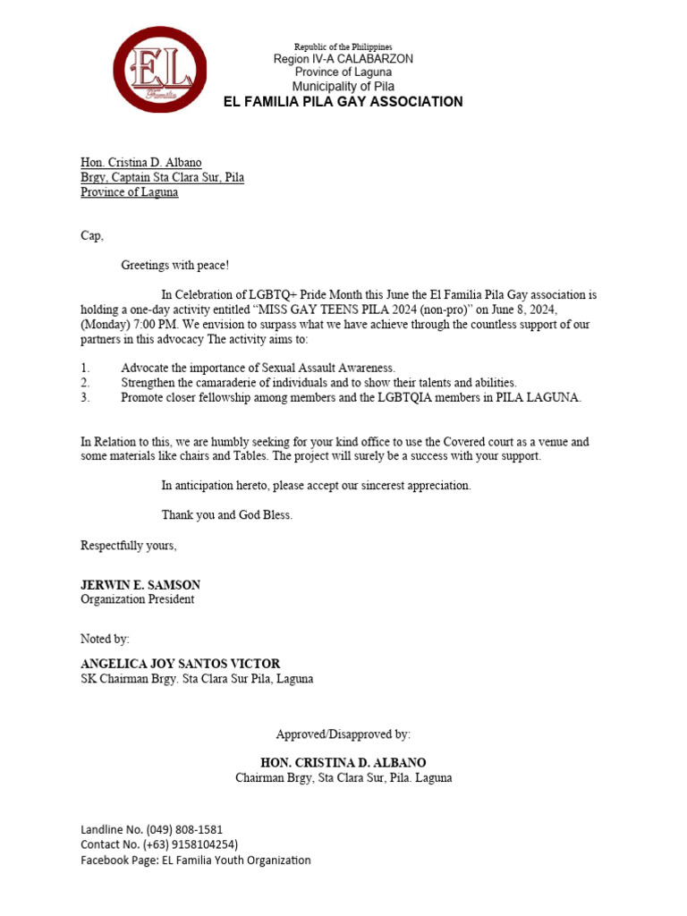 holding a one-day activity entitled “MISS GAY TEENS PILA 2024 (non-pro)” on June 8, 2024,