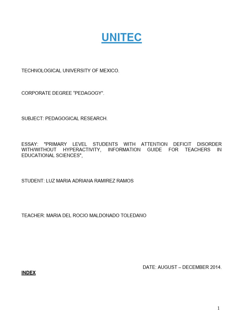 This essay, entitled "Primary level students with attention deficit disorder with/without hyperactivity, information guide