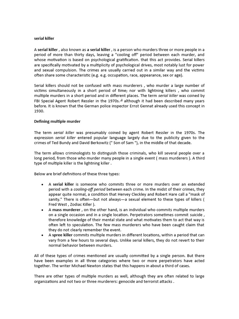 multiple murders in a short period and in different places. The term serial killer was coined by
