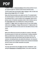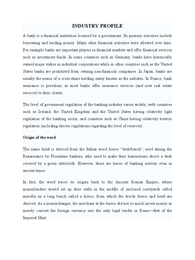 A bank is a financial institution licensed by a government. Its primary activities include borrowing and lending money. Many other financial activities were allowed over time. For example banks are important players in financial markets and offer financial services such as investment funds. In some countries such as Germany, banks have historically owned major stakes in industrial corporations while in other countries such as the United States banks are prohibited from owning non-financial companies. In Japan, banks are usually the nexus of a cross-share holding entity known as the zaibatsu. In France, bank assurance is prevalent, as most banks offer insurance services (and now real estate services) to their clients. The level of government regulation of the banking industry varies widely, with countries such as Iceland, the United Kingdom and the United States having relatively light regulation of the banking sector, and countries such as China having relatively heavier regulation (including stricter regulations regarding the level of reserves). Origin of the word The name bank is derived from the Italian word banco "desk/bench", used during the Renaissance by Florentine bankers, who used to make their transactions above a desk covered by a green tablecloth. However, there are traces of banking activity even in ancient times. In fact, the word traces its origins back to the Ancient Roman Empire, where moneylenders would set up their stalls in the middle of enclosed courtyards called macella on a long bench called a bancu, from which the words banco and bank are derived. As a moneychanger, the merchant at the bancu did not so much invest money as merely convert the foreign currency into the only legal tender in Romethat of the Imperial Mint.
