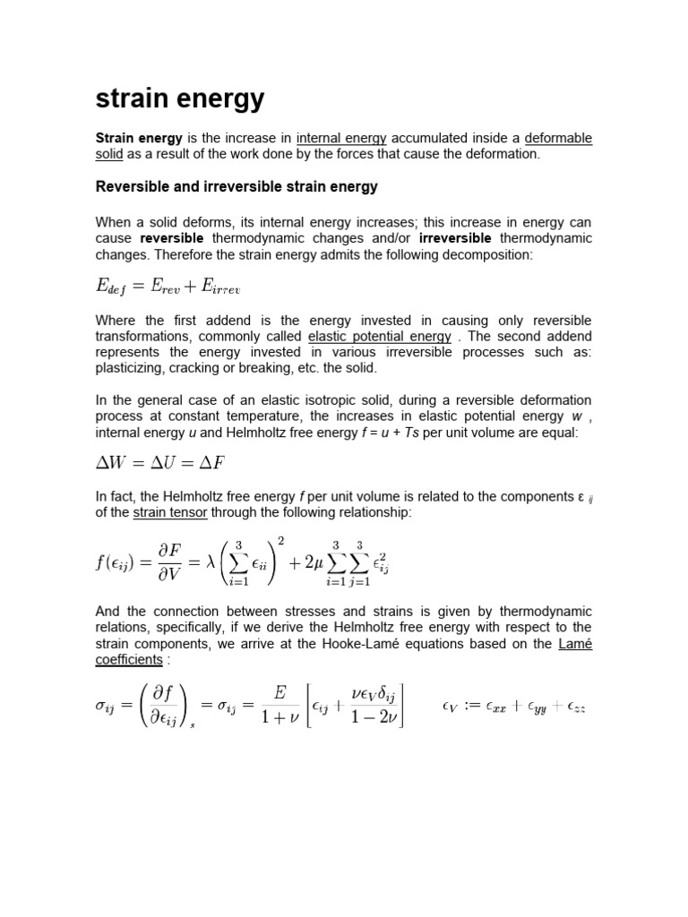 strain energy . For a linear and isotropic elastic solid, the elastic potential energy as