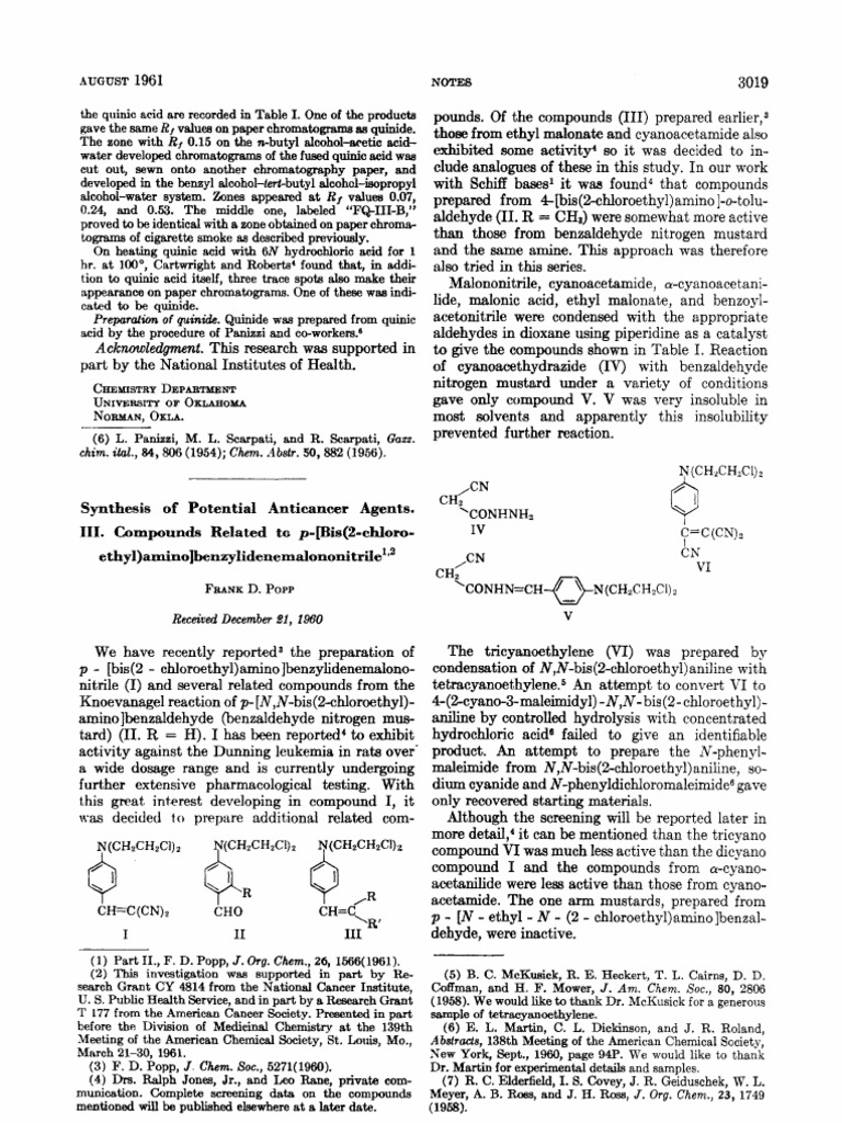 (1) P r 111, F. D. Popp, J . 01.8. C h . ,26,3021 (1961). at a (2) This investigation w s supported in part by a Research Grant T 177 from the American Cancer Society.