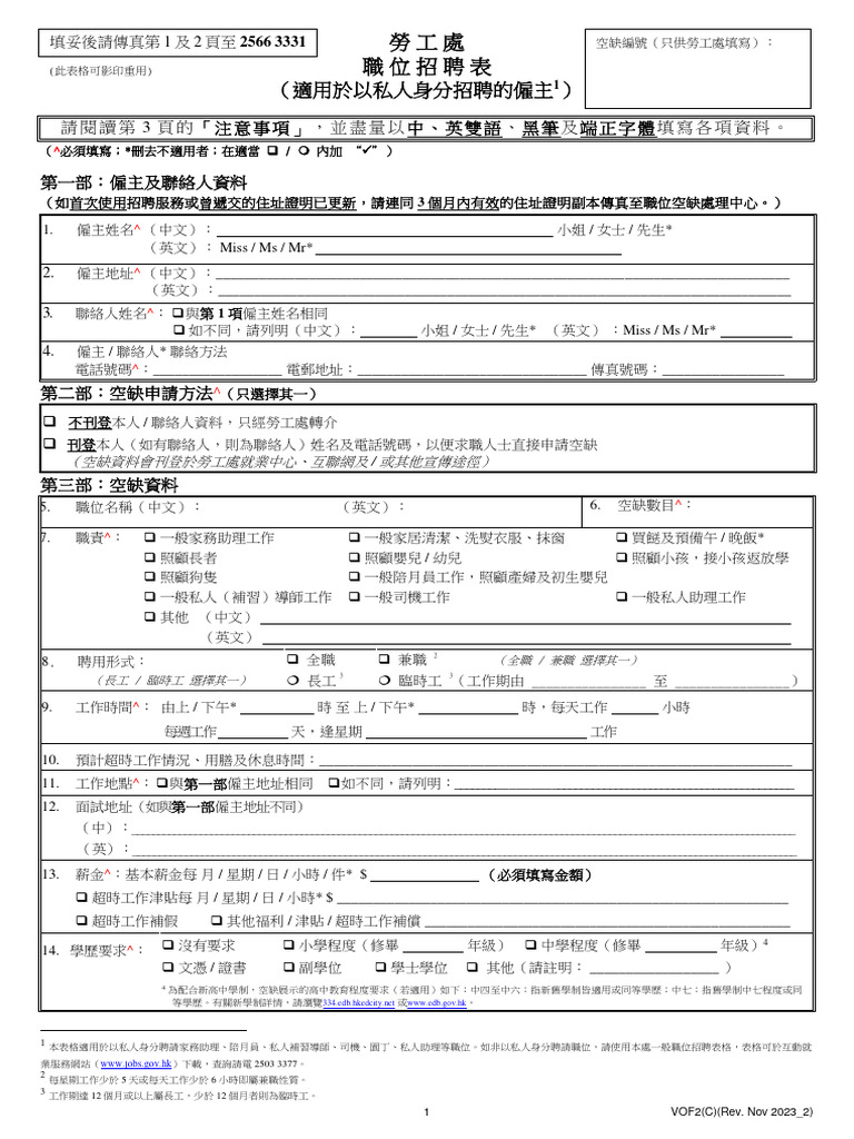 填妥後請傳真第 1 及 2 頁至 2566 3331 勞工處 空缺編號(只供勞工處填寫):