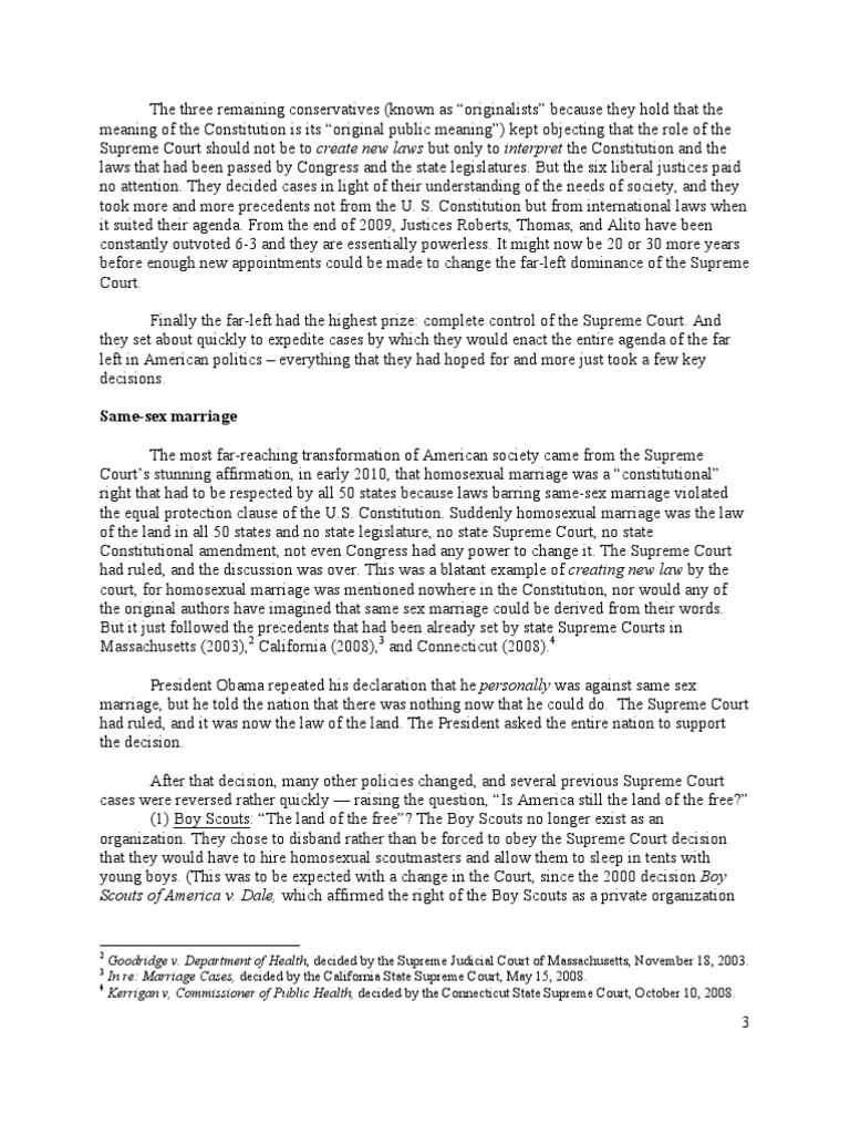 the Constitution and the laws that had been passed by Congress and the state legislatures. But the six liberal justices paid no attention. They decided cases in light of their understanding of the needs of society, and they took more and more precedents not from the U. S. Constitution but from international laws when it suited their agenda. From the end of 2009, Justices Roberts, Thomas, and Alito have been constantly outvoted 6-3 and they are essentially powerless. It might now be 20 or 30 more years before enough new appointments could be made to change the far-left dominance of the Supreme Court. Finally the far-left had the highest prize: complete control of the Supreme Court. And they set about quickly to expedite cases by which they would enact the entire agenda of the far left in American politics – everything that they had hoped for and more just took a few key decisions.