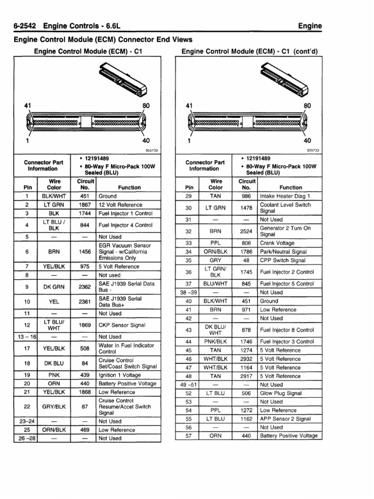 6-2542 Engine Controls - 6.6L Engine Engine Control Module (ECM) Connector End Views Engine Control Module (ECM) - C1 Engine Control Module (ECM) - C1 (cont'd) 41 80 4 80 1 40 1 40 TTaTaTae Taare Connector Part | | oosWay F McroPack 1000 Connector Part | | aosayF Mcro-Pack 1000 ‘Sealed (BLU) Sealed (BLU) wre] eu Wire| Great pn | cor | “ne Function vin | _cace_| Shee Function 1 [Bue | —a61 | Ground 28 [TAN | —e86 | ake Heatr Dig Z [tran | “tas7”[ 1 Van Roto so | cr arm | tare | Soolnt Cover Sich 3 BLK 11744_| Fuel injoctor 1 Control ‘Signal ee ee CC | BET [eae | Fue mecter 4 coma Rel ueed ce | ean | aoe | Sener 3 = —_| Not Used gna ee [PR a6 rank Vatage 6 | eww | 1480 | Spr Smcuicme 34 [ ORWELK | “17e6 | Pan Nowra Spa Ealsacrs On 3e_[_anY —[ — a8 [GPP Sich Sina TT YEDBE [B75 [5 Vat Reeves a. jf ee [ae [vet he ae | FESR | aras | Fuet mecor2 Conve @ | ovann | baz | SAE 1050 Sin bn 37 Blunt | eee Fotos Cott ws] — | — [Wot see SAE TeR9 Sova ae vo [vex | ase | SESE 2 | RT| ar |e Tote 7 pares — [nots Tau 12 1260 | cx Sensor Srl wt ei «3 | PRB [ere | rust mecor Conve ate — [oo cs Ga] FcaL | Tra Fot sar Contr 17 | YEUBLK | 508 | Control a TAN 274 _| 5 Volt Reference raise Cora [We | 282 [= Vol Raerence ad ideo 84 | SetiCoast Switch Signal 47 | WHT/BLK 1164 | 5 Volt Reference 73_[ Fe | 85 [onon Voge @e_[ Ta [2517 [5 Vor Reeence B0_[ —ORN—[ 440 [ Bator Postve erage | © apap —— Tot Used Fi | VEUBL | 1868_[Low Rotorence @ [ira | aoe ow Ps Sera ~ le 7 Sse cel nets De | sees Sa [ PRL] 1072 [Low Reterence sep S| rely | “1162 [APP Sensor 2 Sa 25_| ORNBLK | 469 | Low Reference a = Ese Not Used! of arom Baty Posie WooEngine Engine Controls - 6.6L _6-2543 Engine Control Module (ECM) - C1 (cont'd) Engine Control Module (ECM) - C2 “1 80 1 40 > 2101488 error tor Connector Part Connector Part | So way ¢ Micro-Pack 100W ennector Part | gosay F Micro-Pack 100W Sealed (BLU) Sealed (CLA) Wire| Creu Wire | Chou pin | color_| “No. Function Pin | _coler_| ‘Ne. Function 38 | DKGAN | 1040 | Caos 2 Serial Data 1 [aver [451 [Ground EGR Valve Vacuum so] Yet | 710 | Cass 2 Soral Data > | wwe | oar [scons conta eo | — [Not Used ‘walforia 61_| PRRBLK | 682 | Low Reterence Emissions Only pS Se Backup Lamp Supp 62 | UTGAN | 1324 | Vohage aid é YEL 305 _| Glow Plug Relay Control [= = [Nat Used rol aoa = _ [Not used oe_| BLK | 662 | Low Reference DK GRN7 Fuel Pump Relay 3 aR | “ars [ow Ral a} wert | Ef conte aes Low Ros ee = = = TNC High Pressure 7o_| BAN | 1174 [Od Level Switch Signal 1 | okavu | os | Recirculation Suton 71_[ orern | 488 [PTO Enabie Sonal Ss ee T2_| ORGAN | 1165 [APP Sensor Sinal 7a Seat | son? Senoor Spa 1a | vel] 2520 | PTO Feedback Status Tap WE | ato et Sono Sonat 14_[ UT GAN | 482 | Boost Sensor Signal 7 PNK 7020 | OW/Aun/Crank Voltage a ea a) Sa wee om ulse Control On 76_[ YELaLK | 646 | Fuel Injector 6 Contot we | ory | 397 | Sitch Somat 7_| REDBLK | _@77 | Fuel jector7 Control orca 7e_| PPL | 985 [IA Heater Relay Control 17 | war | 2528 | AC Request Signal 79_| GRv/eLk | 2219 | FICM Relay Control 18 LT BLU 1320_| CHMSL Supply Voltage ane] tanya | iireo La pemeai 19_[ BLKWwiT | 1695 [Ave Switch Signal TT GAN VSS Low Signal (Except 20 | Meux™ | 2 | Alison VSS High Signal (excopt oy Leeuw | [Ki ‘Signal Figh Front = vet | 400 | tton Transmission 2] =| Not Used 23_| OANBIX | 619 | Low Reterence 2a [| DK BLU | 1161 [APP Sensor 1 Sigal 25 [VEL | 1576 | Fuel Temperature Signal 3 -23| _ — — | Not Osea 2_| GRY] 507] Vo Reference6-2544 Engine Controls - 6.6L Engine Engine Control Module (ECM) - C2 (cont'd) Engine Control Module (ECM) - C2 (cont'd) rr) Se) Connector Part | | So. way F Micro-Pack 100W Connector Part | | soeay F Micro-Pack 1004 Sealed (CLR) Seated (CLR) Wire| Circuit Wire | Cireuit pin | Color_| ‘No. Function pin | color_| “No. Function 2-33] — — | Not Used se | on | 2 [feggecreuow 3 | DKaAN | ter | Recioulation Door le Sig Contra _|-OKBLU| 2867 [TOM IL Rogues DK GANT "NC Compressor Glich Fuel Level Sensor ee WHT — Relay Control = oe 1909 ‘Signal - Primary 35_| PRKWHT | 17O1_| Damping LOI Signal w | oxanw | wo [NCubu Pesaie 36 | pkeiu | so7_| Waitto Start indicator witch Signal Contr S| UTELU_| 464] PTO Engine Diablo 37_|_PPL | 2562 [PTO Engage Sigal 37_| ORWELK | 510 | Low Roforence | — —_[ Not Used 38_|_YEL__| 2916 FRP Sensor Signal 33_|_ RED | 631] 12 Vor Reference TCO Brake a so | ppc | 420 | Swnehvense Contes ft ae [BT ae ete eee Se a Fain as Agua 0. BAN 7i8_[Low Reference el Pressure Regulator a2_| eum | asso | Evel Pressure Reaulator of — [Not Used ato —Trertesd G2 TAN | 806 [intake Heater Diag? 44 [PNK | 1068 | fgiion + Votage 63 _[ rvreix [1694 [4WD Low Signal a SS Nar Used 4_| GRY/BLK | 439 _| Baro Sensor Signal ee 65_[_YEL__| _492__| MAF Sensor Signal EGR Throttle Valve 86 ~72| a = _| Not Used Dk GAN’ Vacuum Solenord Fuel Level Sensor 47 WHT 428 | Control - wiCalifomia 73 OK BLU 1998 | signal - Secondary Emissions Only ‘74-75 = —_|NotUsed EGR Vacuum Vork 7 a Se 76_[ CTBLU | 2890 [Engine Speed Signal wrcatonia a Tver} anaa | Fue! Pressure Regulator Emissions Only Solera Convo! @@_|_YEUBIK | 1827 | Vehicle Speed Signal 7e__[ OANELK | 1087 [Low Reference DK GANT 73-00 Not Used so | PKGANT] er7 | venicle Speed Signal Sita |_ar2 [WAT Sensor Signal