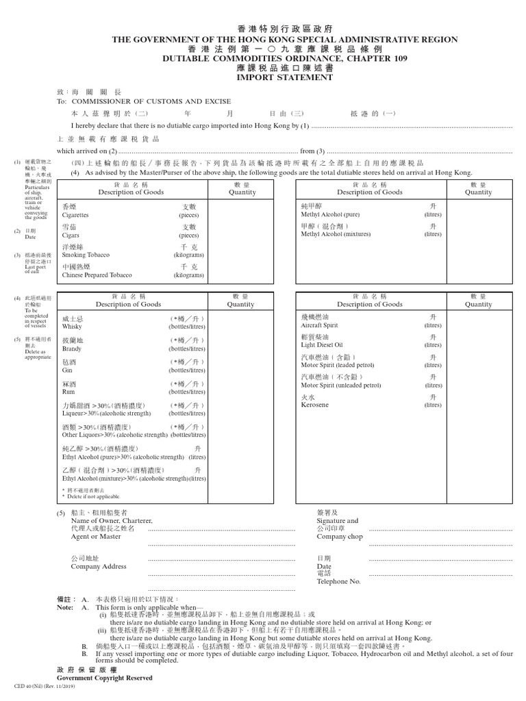 I hereby declare that there is no dutiable cargo imported into Hong Kong by (1) .........................................................................................................
