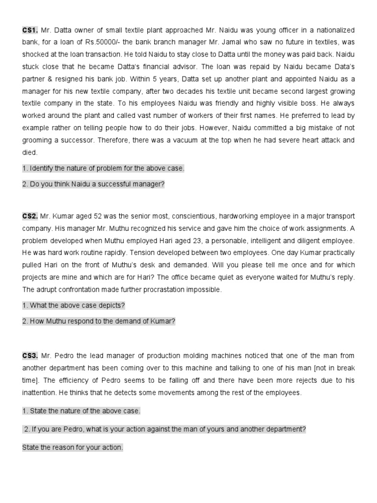 CS3. Mr. Pedro the lead manager of production molding machines noticed that one of the man from another department has been coming over to this machine and talking to one of his man [not in break time]. The efficiency of Pedro seems to be falling off and there have been more rejects due to his inattention. He thinks that he detects some movements among the rest of the employees. 1. State the nature of the above case. 2. If you are Pedro, what is your action against the man of yours and another department? State the reason for your action.