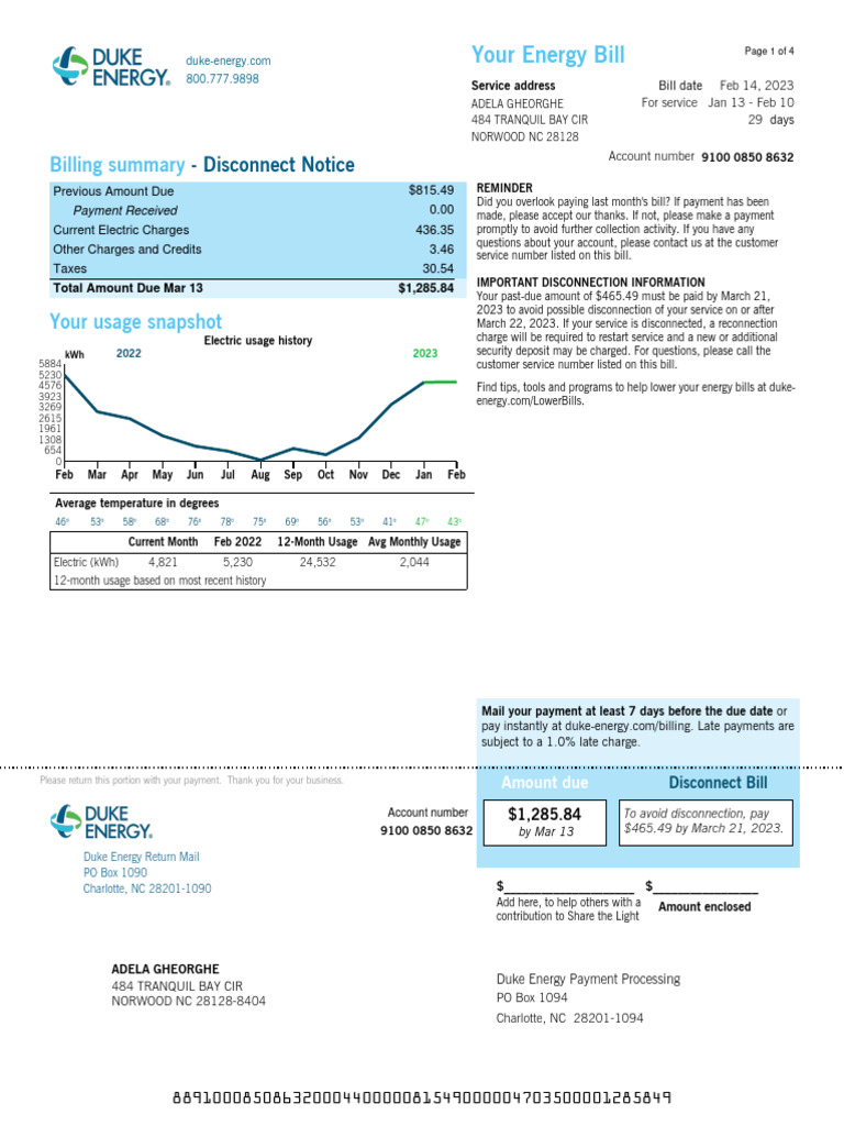By mail payable to Duke Energy P.O. Box 1094 procedures. If your service is disconnected