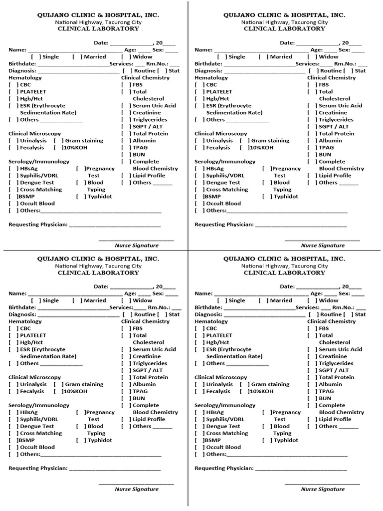 [ ] Syphilis/VDRL Test [ ] Lipid Profile [ ] Syphilis/VDRL Test [ ] Lipid Profile