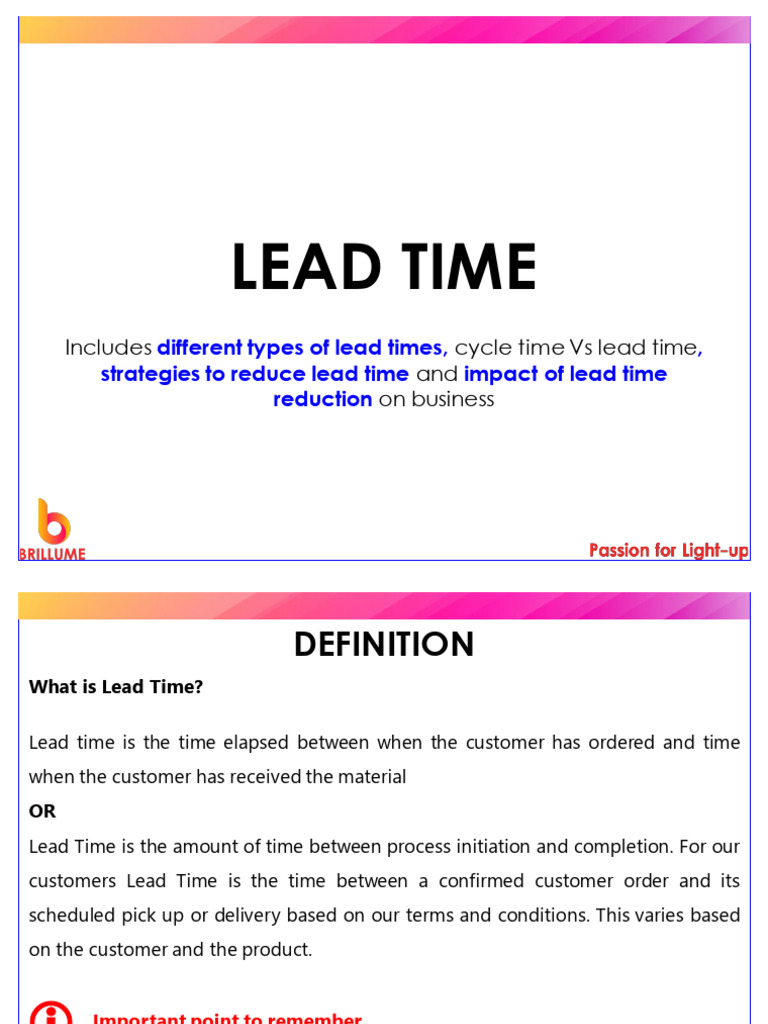 Includes different types of lead times, cycle time Vs lead time,