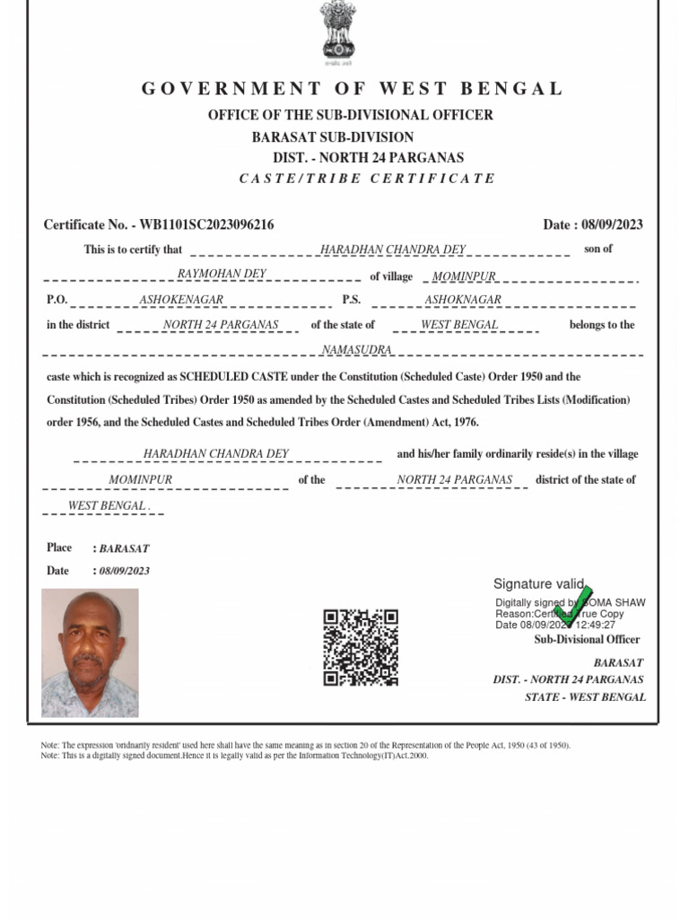 HARADHAN CHANDRA DEY and his/her family ordinarily reside(s) in the village