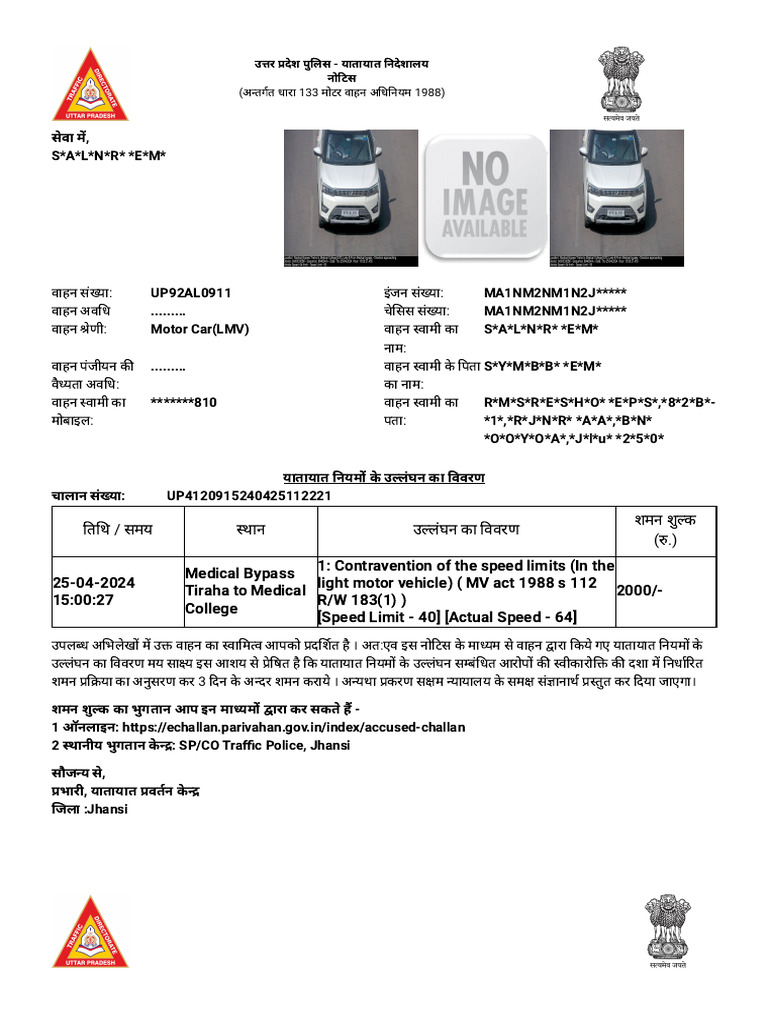 उपलब्ध अभिलेखों में उक्त वाहन का स्वामित्व आपको प्रदर्शित है । अत:एव इस नोटिस के माध्यम से वाहन द्वारा किये गए यातायात नियमों के