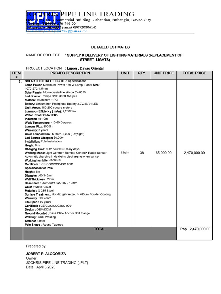 NAME OF PROJECT : SUPPLY & DELIVERY OF LIGHTING MATERIALS (REPLACEMENT OF