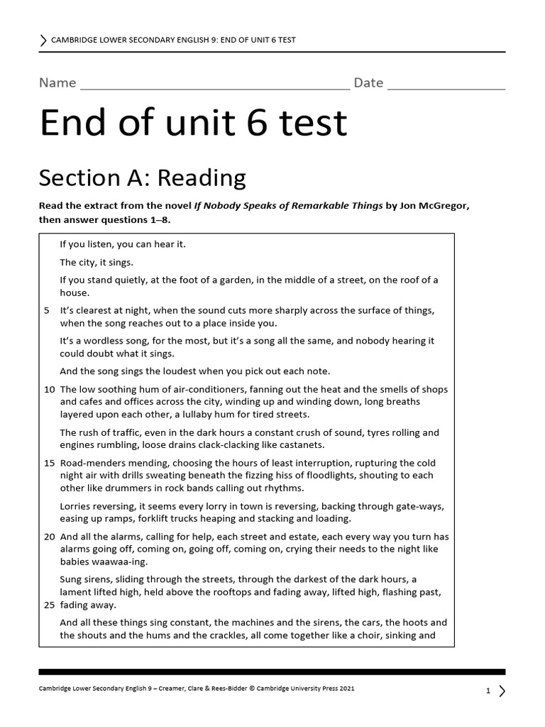 CAMBRIDGE LOWER SECONDARY ENGLISH 9: END OF UNIT 6 TEST