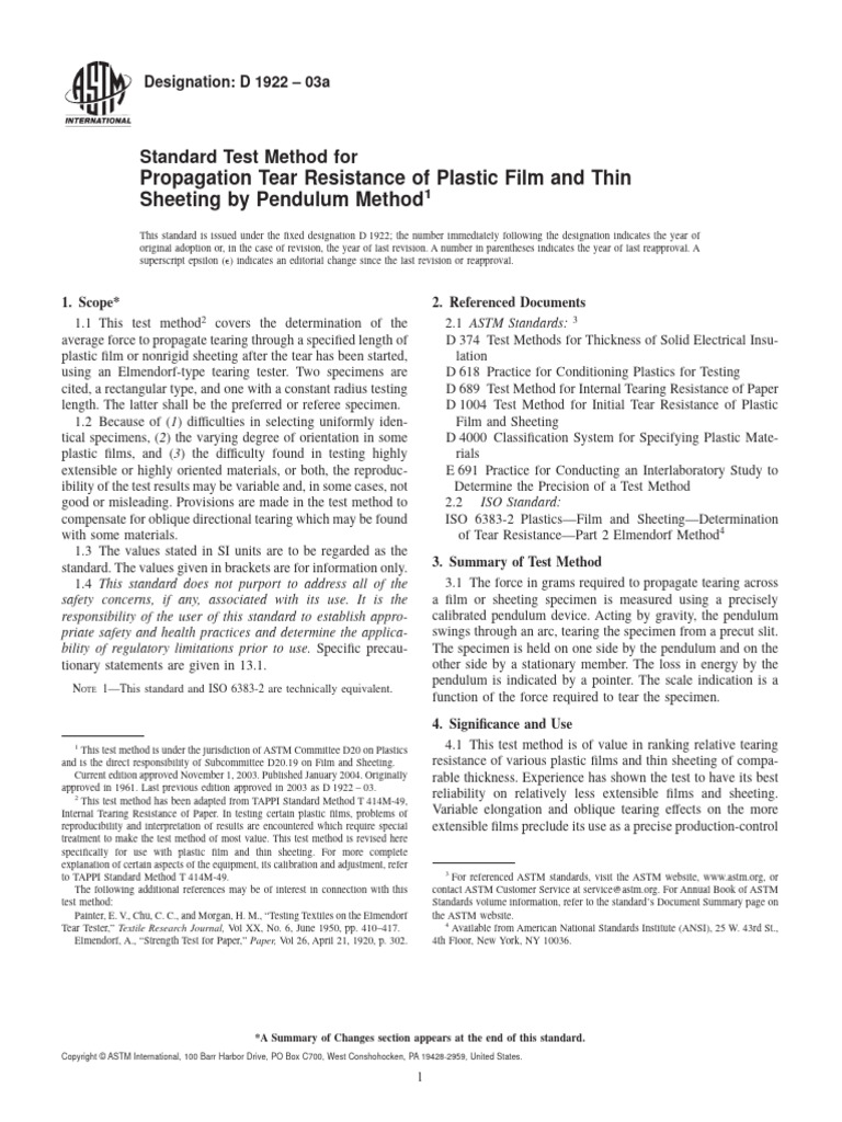n = 1, or number of plies, if used. See Note 6. TABLE 1 Propagation Tear Resistance (Elmendorf Tear) Machine