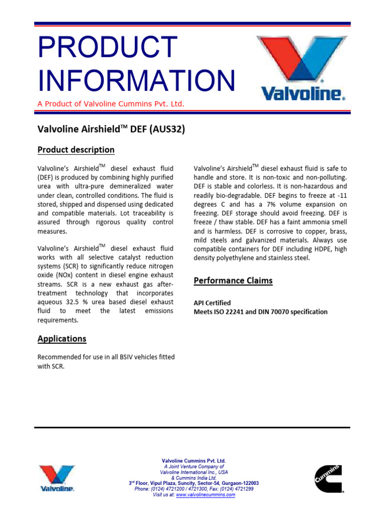 Valvoline’s AirshieldTM diesel exhaust fluid Valvoline’s AirshieldTM diesel exhaust fluid is safe to