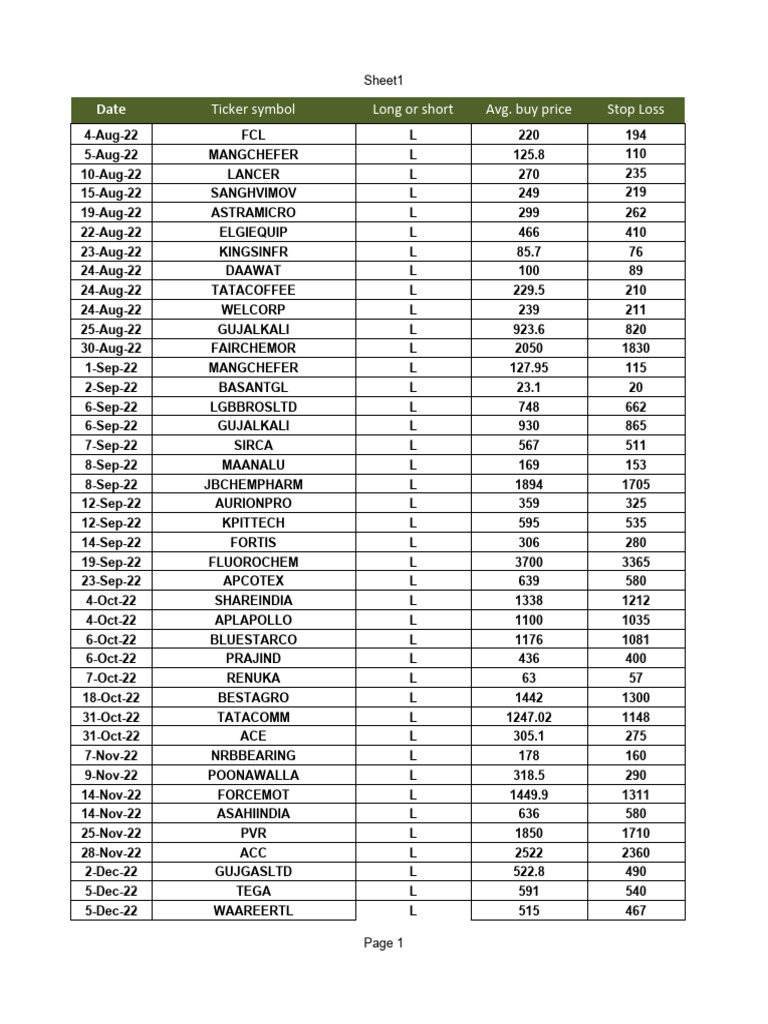 Date Ticker symbol Long or short Avg. buy price Stop Loss