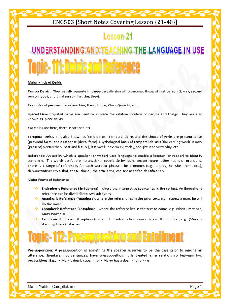 Reference: An act by which a speaker (or writer) uses language to enable a listener (or reader) to identify