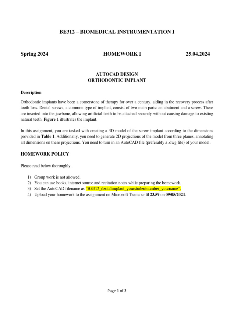 3) Set the AutoCAD filename as “BE312_dentalimplant_yourstudentnumber_yourname”.