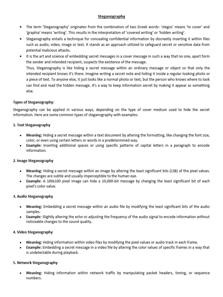 information. Here are some common types of steganography with examples: