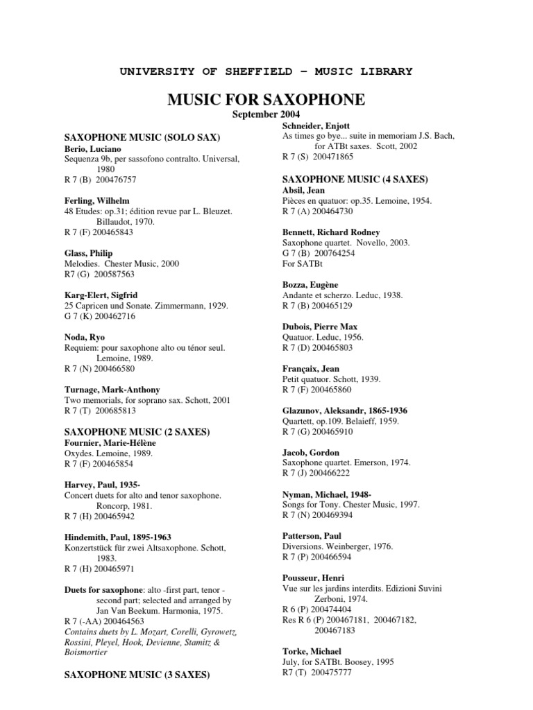 Absil, Jean Pices en quatuor: op.35. Lemoine, 1954. R 7 (A) 200464730 Bennett, Richard Rodney Saxophone quartet. Novello, 2003. G 7 (B) 200764254 For SATBt Bozza, Eugne Andante et scherzo. Leduc, 1938. R 7 (B) 200465129 Dubois, Pierre Max Quatuor. Leduc, 1956. R 7 (D) 200465803 Franaix, Jean Petit quatuor. Schott, 1939. R 7 (F) 200465860 Glazunov, Aleksandr, 1865-1936 Quartett, op.109. Belaieff, 1959. R 7 (G) 200465910 Jacob, Gordon Saxophone quartet. Emerson, 1974. R 7 (J) 200466222 Nyman, Michael, 1948Songs for Tony. Chester Music, 1997. R 7 (N) 200469394 Patterson, Paul Diversions. Weinberger, 1976. R 7 (P) 200466594 Pousseur, Henri Vue sur les jardins interdits. Edizioni Suvini Zerboni, 1974. R 6 (P) 200474404 Res R 6 (P) 200467181, 200467182, 200467183 Torke, Michael July, for SATBt. Boosey, 1995 R7 (T) 200475777