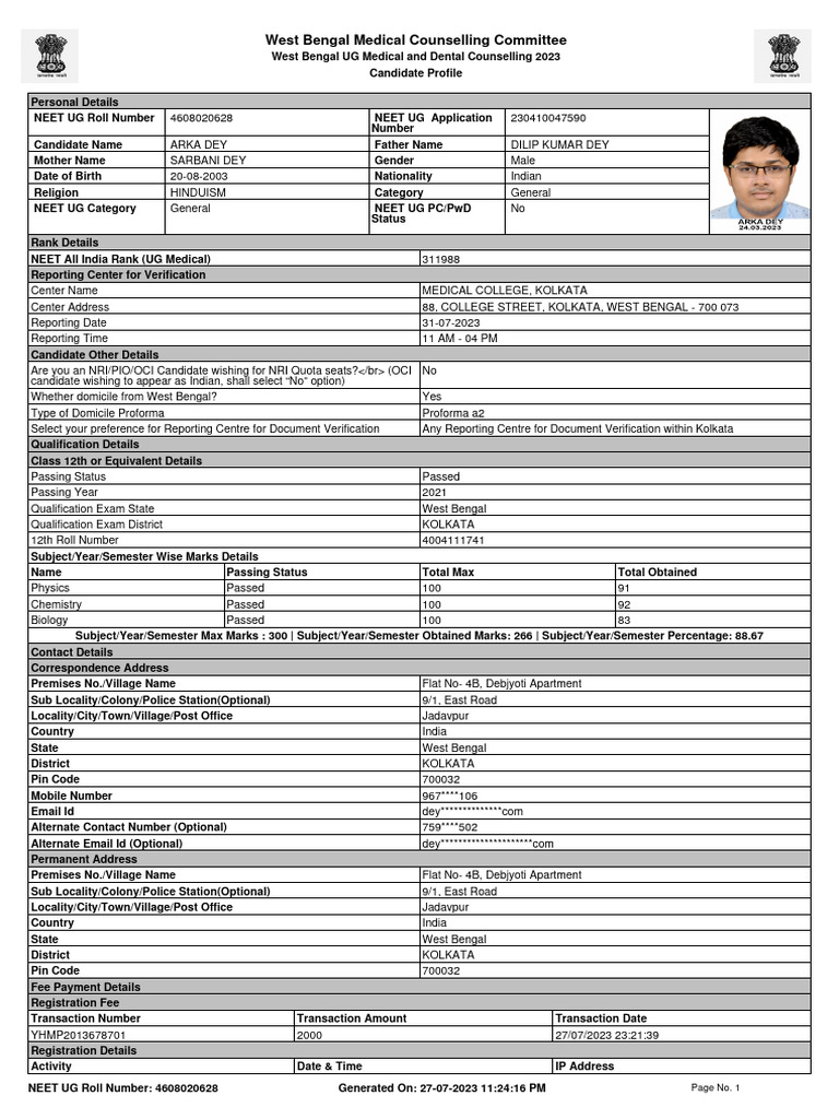 Candidate Name ARKA DEY Father Name DILIP KUMAR DEY