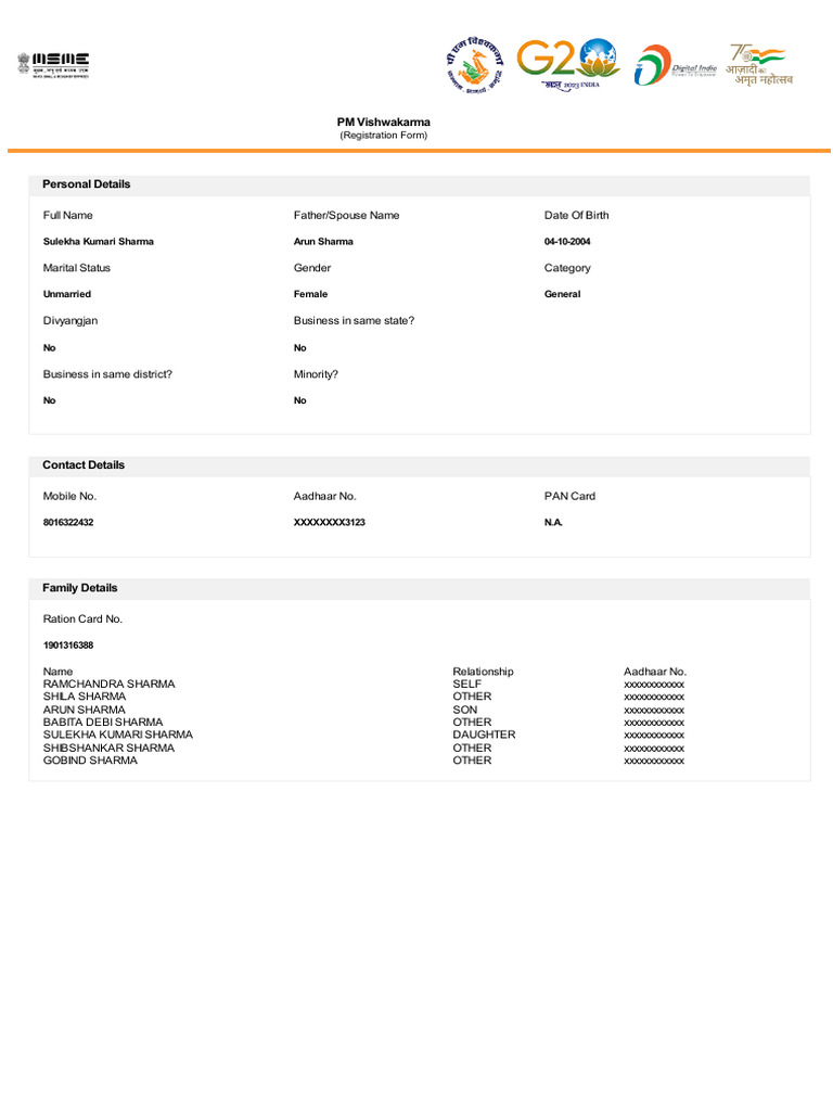 2. I hereby declare that apart from myself, no other member of my family has registered for PM Vishwakarma and that no member of my family is in