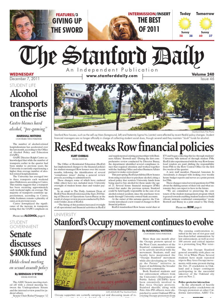 and supplemented existing partnerships with Business Affairs, Boswell said. During the first comprehensive review conducted by Director Buzay, the department identified several compliance issues that required attention and worked together with the Auditing Office and other Business Affairs partners to make corrections. This past spring,ResEd prohibited Row houses from using social dues to purchase alcohol, citing a school policy that restricts University funds from being used to buy alcohol for those under the age of 21. Several house financial managers (FMs) noted that under the previous system, Stanford could be held legally responsible in the case of an alcohol-related accident, since the purchases were made through University-owned bank accounts. At the outset of this autumn quarter, the University introduced a new round of changes to Row financial policies. ResEd standardized Row house social dues at
