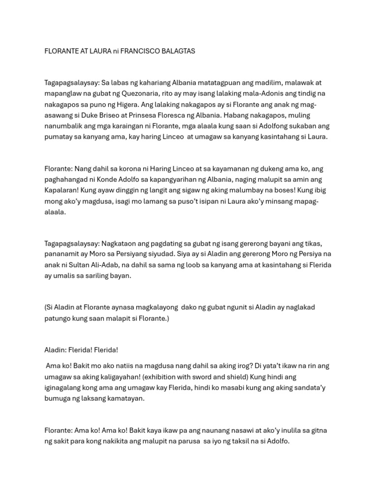 Florante: Ay, mahal kong Laura, paalam na ang abang sinta mong kinulang palad. Gayon