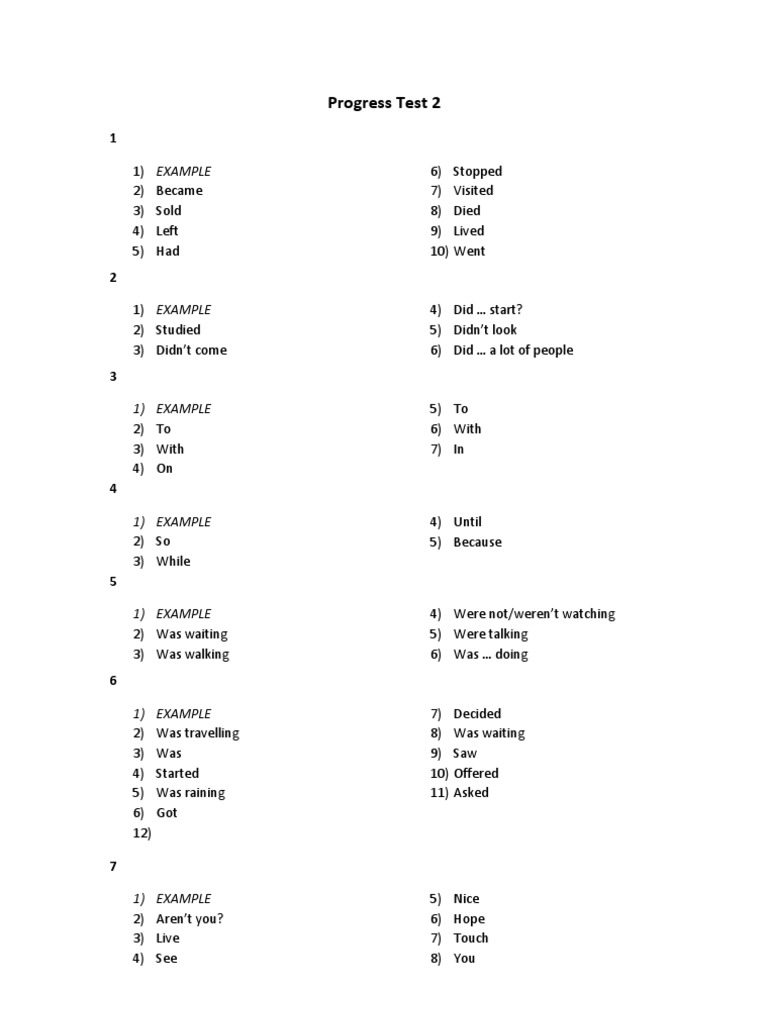 1 1) 2) 3) 4) 5) 2 1) EXAMPLE 2) Studied 3) Didnt come 3 1) 2) 3) 4) 4 1) EXAMPLE 2) So 3) While 5 1) EXAMPLE 2) Was waiting 3) Was walking 6 1) 2) 3) 4) 5) 6) 12) 7 1) 2) 3) 4) EXAMPLE Arent you? Live See 5) 6) 7) 8) Nice Hope Touch You EXAMPLE Was travelling Was Started Was raining Got 7) 8) 9) 10) 11) Decided Was waiting Saw Offered Asked 4) Were not/werent watching 5) Were talking 6) Was doing 4) Until 5) Because EXAMPLE To With On 5) To 6) With 7) In 4) Did start? 5) Didnt look 6) Did a lot of people EXAMPLE Became Sold Left Had 6) 7) 8) 9) 10) Stopped Visited Died Lived Went