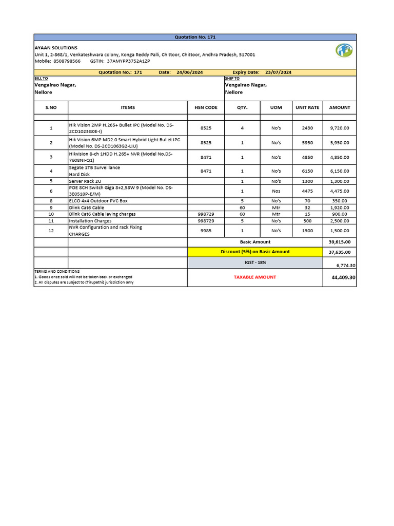 Quotation No.: 171 Date: 24/06/2024 Expiry Date: 23/07/2024