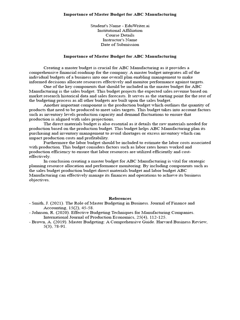 - Smith, J. (2021). The Role of Master Budgeting in Business. Journal of Finance and