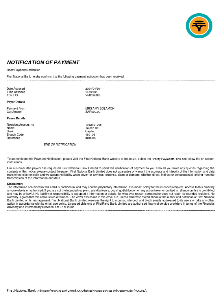 To authenticate this Payment Notification, please visit the First National Bank website at fnb.co.za, select the “Verify Payments” link and follow the on-screen