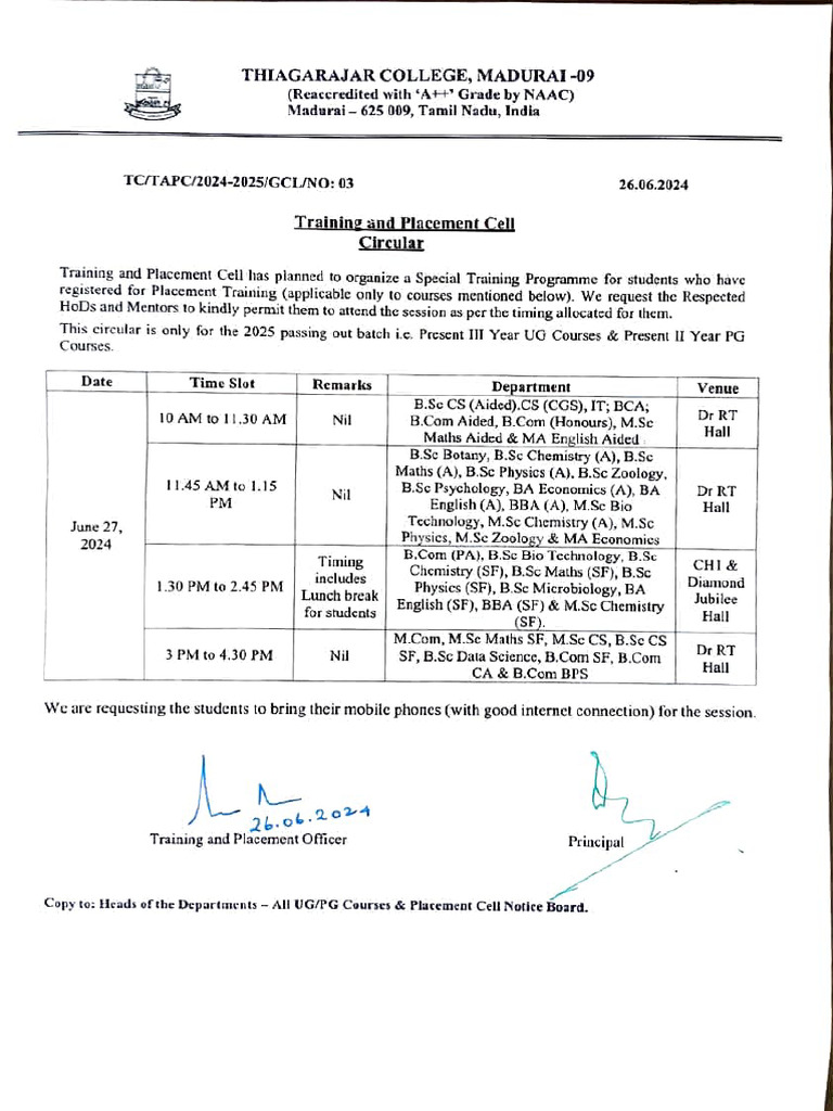 Copy to: Heads of the Departments All UGPG Courses &Placement Cell Notice Board.