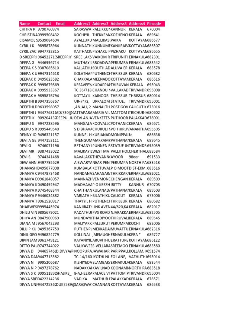 Name Contact Email Address1 Address2 Address3 Address4 Pincode