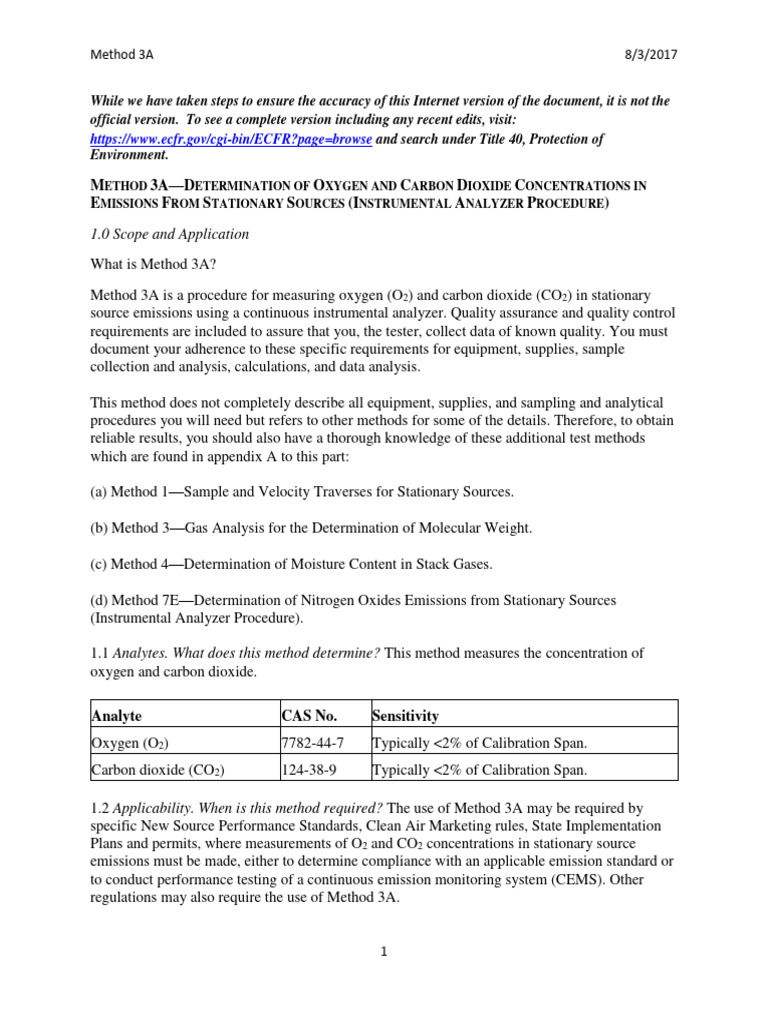 1.2 Applicability. When is this method required? The use of Method 3A may be required by