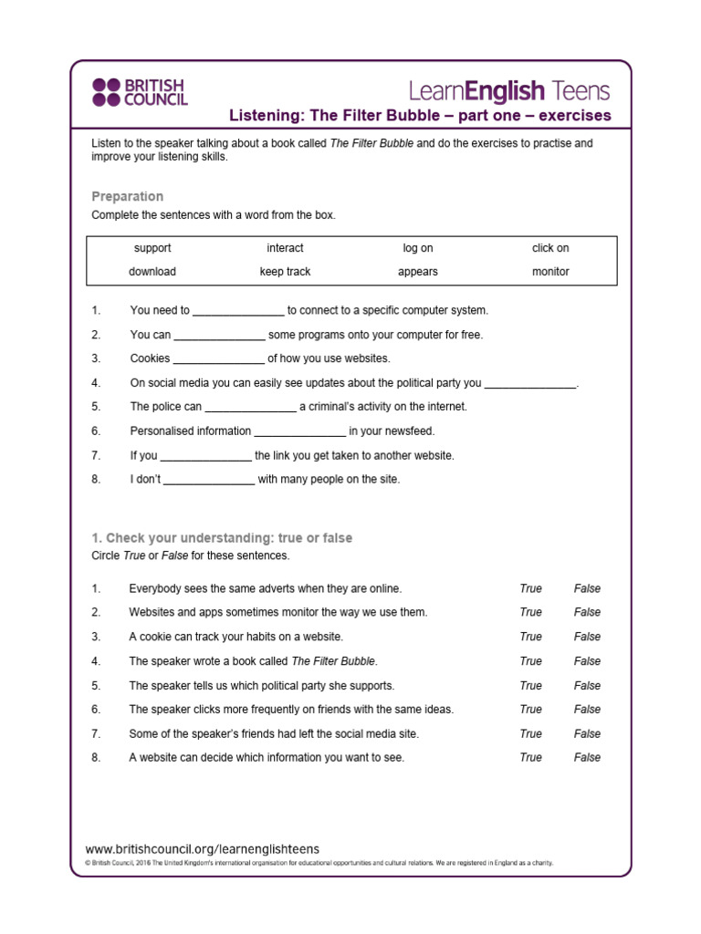 Listen to the speaker talking about a book called The Filter Bubble and do the exercises to practise and