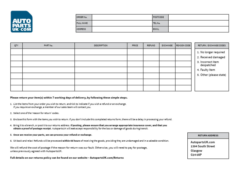 Full details on our returns policy can be found on our website – AutopartsUK.com/Returns