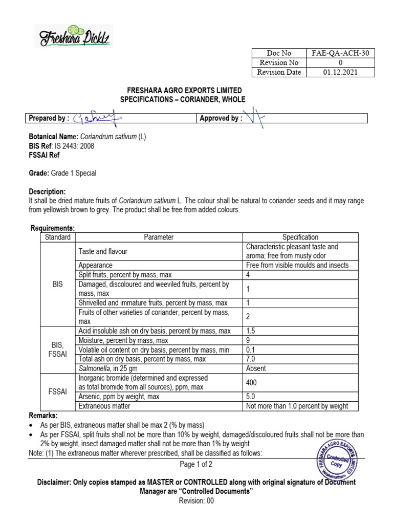 It shall be dried mature fruits of Coriandrum sativum L. The colour shall be natural to coriander seeds and it may range