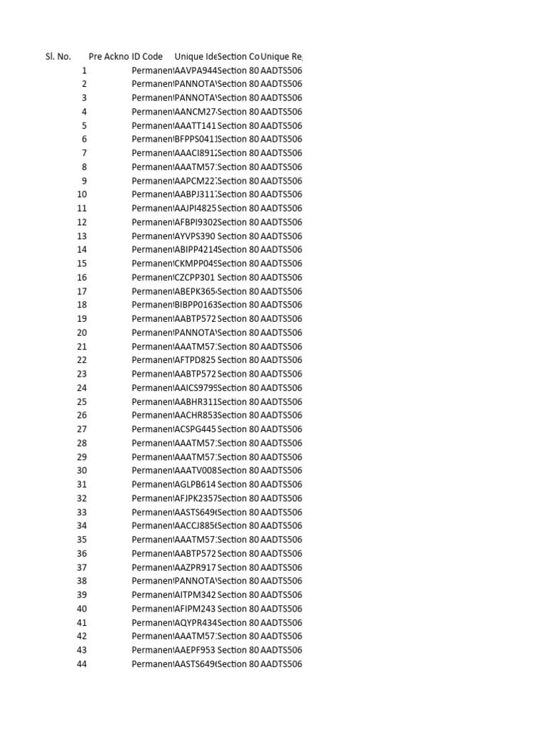 Pre Ackno ID Code Unique IdeSection CoUnique Reg