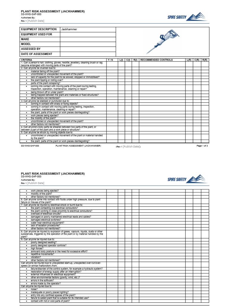 SS-WHS-SAF-000 PLANT RISK ASSESSMENT (JACKHAMMER) (Rev 1 [Publish Date]) Page 1 of 3