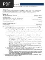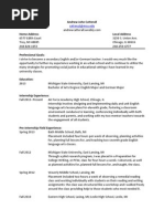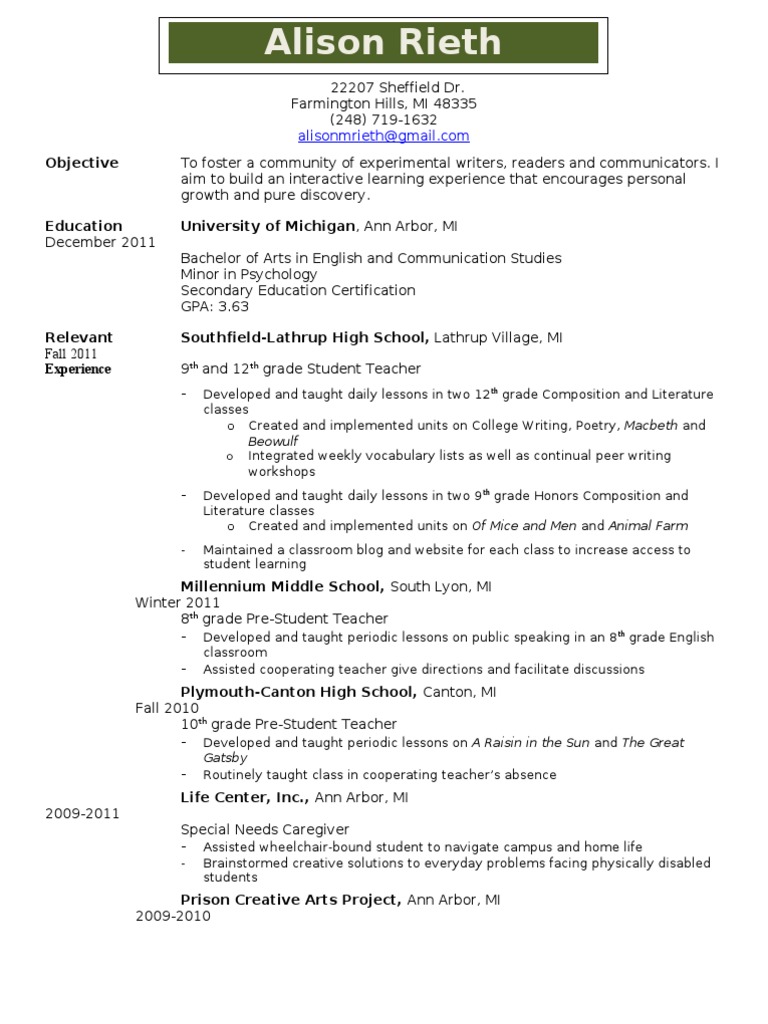 22207 Sheffield Dr. Farmington Hills, MI 48335 (248) 719-1632 alisonmrieth@gmail.com Objective To foster a community of experimental writers, readers and communicators. I aim to build an interactive learning experience that encourages personal growth and pure discovery. University of Michigan, Ann Arbor, MI Bachelor of Arts in English and Communication Studies Minor in Psychology Secondary Education Certification GPA: 3.63 Relevant Fall 2011 Experience Southfield-Lathrup High School, Lathrup Village, MI 9th and 12th grade Student Teacher
