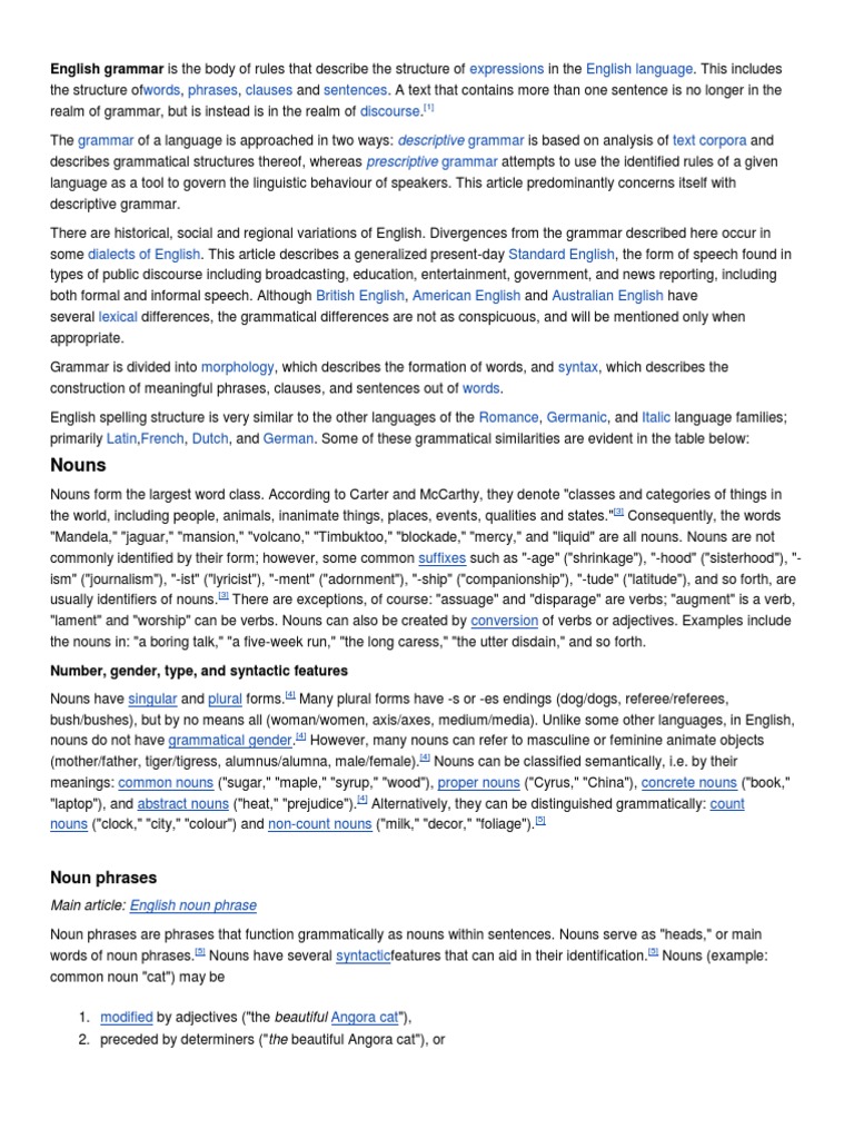 The grammar of a language is approached in two ways: descriptive grammar is based on analysis of text corpora and describes grammatical structures thereof, whereas prescriptive grammar attempts to use the identified rules of a given language as a tool to govern the linguistic behaviour of speakers. This article predominantly concerns itself with descriptive grammar. There are historical, social and regional variations of English. Divergences from the grammar described here occur in some dialects of English. This article describes a generalized present-day Standard English, the form of speech found in types of public discourse including broadcasting, education, entertainment, government, and news reporting, including both formal and informal speech. Although British English, American English and Australian English have several lexical differences, the grammatical differences are not as conspicuous, and will be mentioned only when appropriate. Grammar is divided into morphology, which describes the formation of words, and syntax, which describes the construction of meaningful phrases, clauses, and sentences out of words. English spelling structure is very similar to the other languages of the Romance, Germanic, and Italic language families; primarily Latin,French, Dutch, and German. Some of these grammatical similarities are evident in the table below: