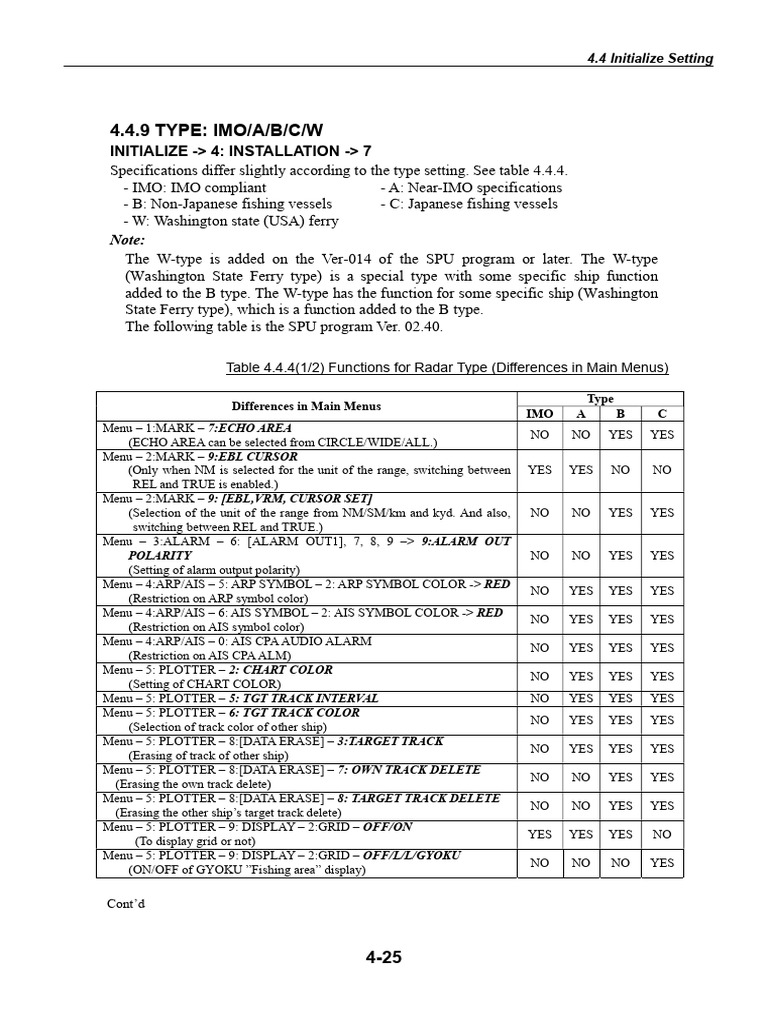 Table 4.4.4(1/2) Functions for Radar Type (Differences in Main Menus)