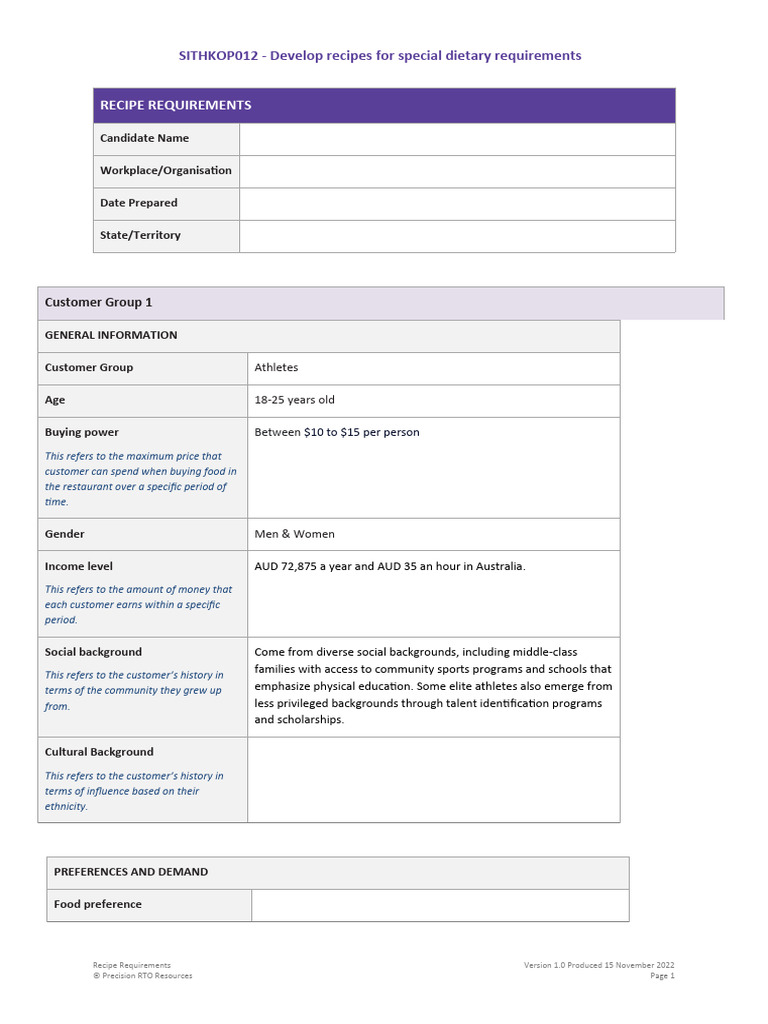 Recipe Requirements Version 1.0 Produced 15 November 2022
