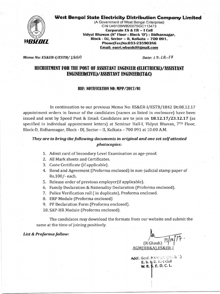 specified in individual appointment letters) at Seminar Hall-I, Vidyut Bhavan, 7™! Floor,